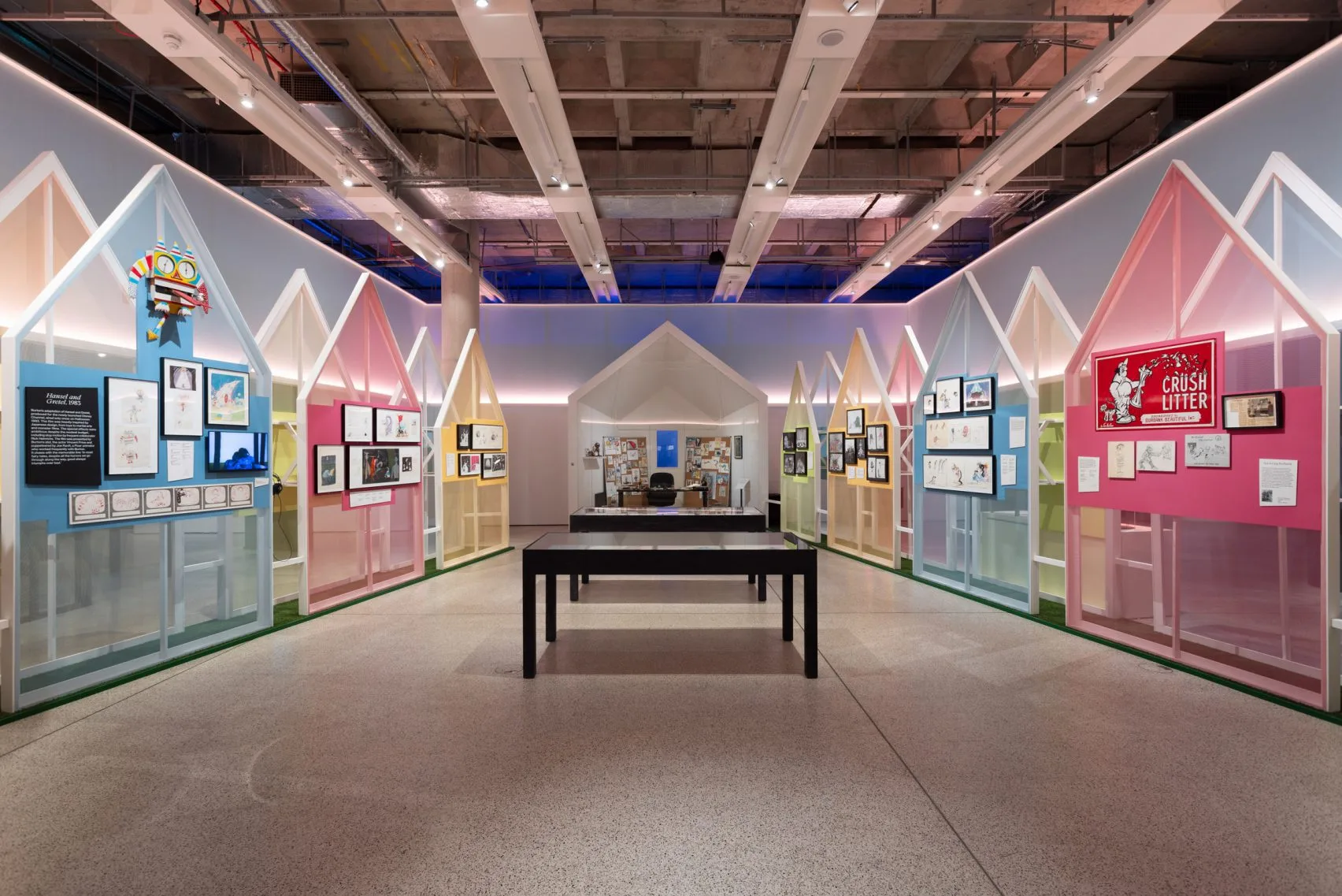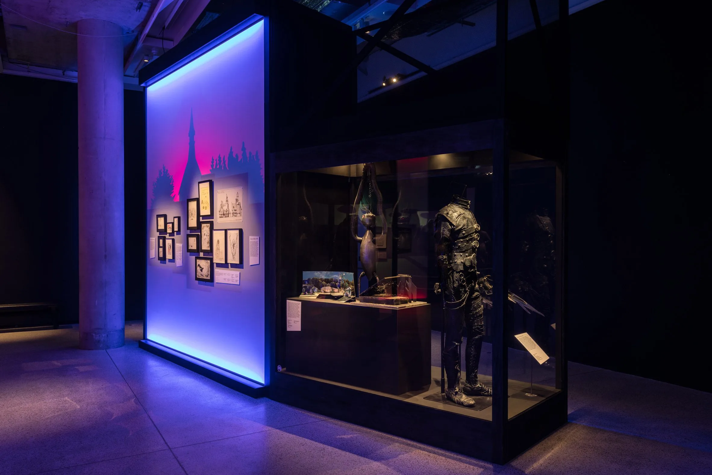 - Childhood Influences: The first room features house-shaped display units reflecting Burton’s suburban upbringing, early drawings and an important design competition entry from his childhood.
